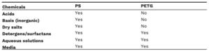 Our precoated plates consist of polystyrene (PS) and the BIOFLOAT™ FLEX coating solution is filled in bottles consist of polyethylene terephthalate (PETG). In Tab.2 chemical resistances of PS and PETG are listed.