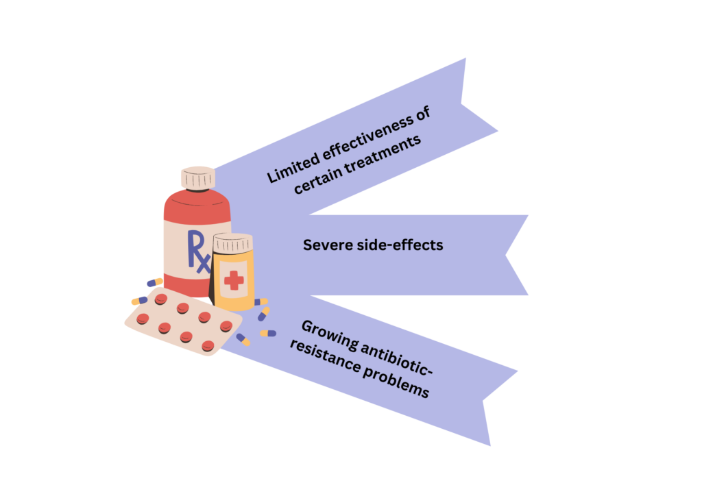 4. Growing antibiotic-resistance problem: The overuse and misuse of antibiotics is a growing problem in healthcare as it limits the effectiveness of many common treatments. It has led to the emergence of antibiotic-resistant bacteria, which can be difficult to treat (3,4).