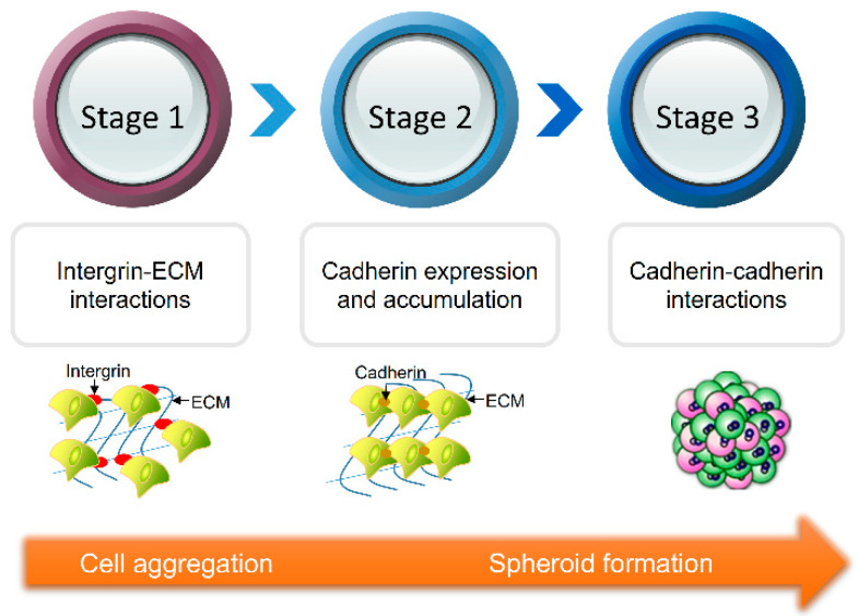 In the third and final stage, the loosely aggregated cells form dense spheroids via cadherin-cadherin binding. Additional external mechanical stimuli conveyed to actin filaments by integrins further encourage spheroid self-assembly.